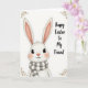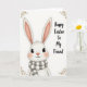 This card shows a long-eared bunny character 🐰 on the left side of a bright white background, drawn with a soft, brushed texture that suggests downy fur. The bunny faces forward with wide, gentle eyes and fine lashes, and its rosy cheeks and small pink nose add a tender, friendly look. A simple curved smile and a cozy striped scarf in light gray and white give it a sweet, cared-for feel, like it’s dressed up for someone special. On the right side, a short Easter message appears in flowing cursive-style lettering, set in a deep charcoal color that echoes the scarf tones. The open space between the bunny and the words keeps the layout airy, as if the bunny is quietly “sharing” the message across the page 🐇. Small botanical accents decorate the scene, with thin green sprigs and tiny orange blossoms placed near the top-left and bottom-right corners. The orange flowers look lightly sun-kissed against the white background, with the lower-right sprig angled upward toward the text.