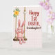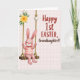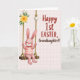 This card shows a soft pastel illustration of a pink, long-eared bunny character 🐰 sitting on a rustic wooden swing, with rosy cheeks and a gentle smile that feels like it’s meant for someone close. The bunny wears a red-and-white striped shirt, adding a cozy pop of color against its light fur. Two thick ropes rise from the swing, dotted with small white round accents, and a cluster of yellow flowers with green leaves blooms near the upper left like a springtime bouquet 🌷. The background is a very light blush-pink grid that adds structure while keeping the scene airy and calm. On the right side, a celebratory message is set in two styles, with the main words in rich red lettering and supporting words in a warm brown typeface. The spacing leaves the bunny as the focal point while the message feels like it’s being offered alongside it, like a sweet note from a friend. Soft, diffused lighting gives the swing and character rounded shading, and the yellow floral cluster sits above the left rope against the pale grid backdrop.