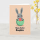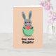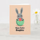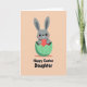 This card shows a sweet digital illustration of a bunny-like character with long ears in soft gray tones, set against a warm peachy-pink background 🌷. The little figure peeks up from a cracked mint-green egg shell, as if popping into view to greet someone special. Its dark, wide eyes and faint rosy cheeks give it a tender, friendly look, like it’s sharing a quiet inside joke with the viewer 🐰. Held close in its small paws is a deep red egg decorated with fine white patterning, adding a cozy, caring touch to the scene. The gentle contrast between the muted character and the brighter egg draws your attention to that shared moment of giving. Centered beneath the illustration, a short Easter greeting appears in thick sans-serif letters, set in a dark tone that stands out clearly on the light background. The layout leaves plenty of open space around the character so the message feels easy to read and the image feels airy. The cracked shell pieces curve outward at the bottom while the red egg sits snugly against the character’s chest.