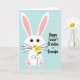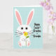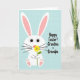 This card features a stylized white bunny on the left, drawn with smooth lines and a gentle silhouette 🐰. Its long ears have soft pink inner shading, matching the small pink pads on its paws, and its round black eyes give it a tender, friendly look. A little pink tongue peeks out as it holds a yellow daisy-like flower close, like it’s offering it to someone special in a quiet, affectionate moment 🌷. The flower has five rounded petals and a brown center, adding a warm splash of color against the bunny’s bright white fur. Behind everything is a pale aquamarine background with a faint grid texture that keeps the scene calm and airy. On the right side, a short holiday greeting is set in dark lettering, arranged in a neat stack so it balances the bunny on the opposite side. The strong contrast makes the message easy to read without taking attention away from the gentle gesture of the character. The aquamarine backdrop stays consistent edge to edge, with the bunny anchored left and the dark text aligned to the right.