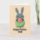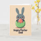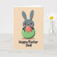This card features a soft-toned illustration of a small gray bunny-like creature with very long ears peeking out from a cracked green eggshell 🐰. Its wide eyes, rosy cheeks, and a gentle wink give it a friendly, affectionate look, like it’s sharing a private joke with someone close. In its tiny paws, it holds a coral-red egg decorated with white polka dots and faint stripe accents, drawing attention to the center of the scene. The background is a pale peach wash that keeps everything light and cozy, with subtle shading that makes the rounded shapes look slightly raised. Beneath the illustration, a short holiday message sits centered near the bottom in dark lettering that stands out clearly against the light background. The layout leaves generous open space around the character, adding a calm, airy feel, with a small 🌷 accent nearby. The green shell edges curve outward in two main pieces, framing the character as it leans forward with the patterned egg held close.