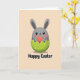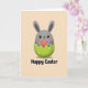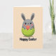 This card shows a plump gray bunny 🐰 with long ears peeking out from a lime-green cracked egg shell at the center of the design. Its big glossy black eyes and rosy cheeks give it a tender, friendly look, as if it’s shyly offering a surprise to someone special. With tiny paws, it holds a coral-red egg decorated with small white flower patterns, angled forward like a sweet gift between friends. The background is a creamy peach tone that keeps the scene soft while letting the green shell and red egg stand out. Near the bottom, a short Easter message appears in dark lettering, centered beneath the bunny for easy reading. Gentle shading and highlights add a bit of depth to the shell edges and the bunny’s rounded face, keeping everything smooth and simple. A few small cracks and curved shell pieces frame the bunny, and a little 🌷 accent sits near the lower area beside the text.