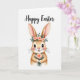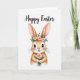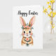 This card features a long-eared bunny centered on a white background, drawn with soft warm-brown fur, pink inner ears, and gentle shading that makes it look cuddly 🐰. Its big brown eyes and tiny pink nose create a tender, friendly expression, with a faint blush on the cheeks that suggests a shy sweetness. A small flower crown rests on its head, mixing blush-pink roses with fresh green leaves, like it’s dressed up for someone special 🌷. In its paws, the bunny holds a petite bouquet in coral and peach tones, angled slightly forward as if offering it to a close friend. Near the top, a festive Easter greeting appears in flowing cursive-style lettering, spaced evenly above the character. The text is set in a soft, warm color that matches the floral accents, keeping the focus on the bunny’s gentle gaze. The bouquet shows layered petals in muted coral and peach with small green sprigs tucked between the blooms.