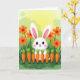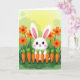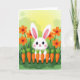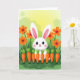 At the center of the card is a plump white bunny with tall, expressive ears lined in soft pink, gazing forward with wide dark eyes, a tiny pink nose, and lightly rosy cheeks 🐰. It appears to peek up from a grassy foreground where a neat row of seven orange root vegetables sits side by side, each topped with small green leaves like a shared garden treat. The bunny’s gentle, curious look and the tidy arrangement of the vegetables suggest a sweet, friendly moment, like someone saving the best bite for a companion 🐇. Behind them, green grasses thicken into taller stems topped with orange petals and deep burgundy centers, adding contrast and a cozy, tucked-away garden feel. Across the top, the background shifts from sunny yellow into soft lime green, like early morning light warming the scene. A light, watercolor-like texture softens edges throughout, giving the plants and bunny a tender, storybook calm. The greeting text sits near the top in a warm orange tone, standing out clearly against the yellow-to-green sky. Below, the seven orange vegetables form a straight line with bright green tops against the rich green foreground 🌷.