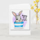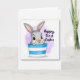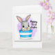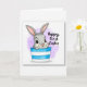 This design shows a grey, long-eared bunny 🐇 peeking out from a horizontally striped container in bright blue and white, with its head and upper body set slightly left of center. Its big black eyes and wide smile, paired with a small pink nose and pink inner ears, give it a sweet, friendly look that feels like a gentle hello to someone close. Two small paws rest on the rim, as if it’s leaning in to share a quiet, affectionate moment. Behind it, a translucent lilac-purple wash forms a soft halo that keeps the scene airy and springlike 🌷. On the right side, a short greeting appears in a flowing, handwritten-style font, set in a dark gray or black color and placed around mid-height to balance the illustration. Fine line details suggest soft fur while the background keeps a watercolor texture that stays light and uncluttered. The container’s stripes run evenly across the front, with crisp white bands alternating with saturated blue bands.