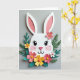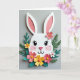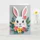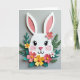 This design shows a sweet long-eared bunny face centered on a soft gray background, drawn in a layered paper-cut style that feels gentle and close 🐰. The bunny’s tall ears are outlined in white with blush-pink inner fur, framing a rounded face that seems to lean in like it’s greeting a friend. Big glossy black eyes with tiny lashes look forward with a tender, affectionate gaze, paired with a small coral triangle nose and a simple curved smile. Light pink lines on the cheeks add a shy, rosy look, like it’s reacting to a kind word. Along the lower edge, a thick garland of flowers and leaves wraps around the bunny, suggesting a springtime bouquet offered with care 🌷. Coral-pink, sunny-yellow, and white blossoms with contrasting centers sit among layered green leaves in several shapes and tones, with soft shadows creating depth. A short Easter greeting appears near the top in a neat, rounded font, set in a darker gray that stands out without overpowering the artwork. The petals and leaves overlap in stacked layers beneath the bunny’s chin, with highlights and shadows giving the arrangement a cut-paper look.