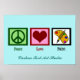 Peace Love Paint poster featuring a pretty peace sign, red heart and a cute art palette. A beautiful turquoise print to hang up in a kids art playroom or an artist's studio. Customize with your own text.
