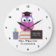 A pretty pink owl with glasses and a graduation cap sits on top of a stack of books for school. Welcome your kindergarten teacher to the class with this cute, personalized classroom clock. Customize the little chalkboard drawing with your own custom quote.