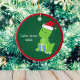 Customize this cute baby dinosaur Christmas ornament with your child's name or other text inside the green and red circle. Personalized kids ornament with a dino in a Santa Claus hat holiding a holiday gift.