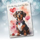 This cute card for the Dachshund Dog Mom or Dad makes a great Valentine's Day card, but can also be used for a birthday or any other special occasion. All the text is easily changed to anything that you'd like. The front has an image of an adorable black and tan Dachshund dog wearing a pink heart collar, with a pink rose at his feet, and heart shaped balloons flying around him. The inside currently says "You make my tail WAG".