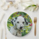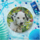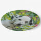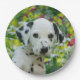 A cute seven weeks old black spotted Dalmatian puppy, portrait in a flowery garden. A puppy-eyed baby doggy photo taken by Katho Menden, this disposable party paper plates are an enchanting gift idea for dog lovers.