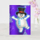 A whimsical little snowman Christmas card with an extremely cute snowman dressed in a shiny black top hat and wearing a blue and white striped scarf. He's dancing in the snow with Christmas trees around him, all on a colorful blue gradient background. This very festive card will be a big hit with whoever is lucky enough to receive it. The text inside (which simply reads, Merry Christmas, can be personalized to suit if needed).