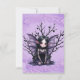 Cute Dark Fairy with Bat Wings. A cute, stylized dark fairy with large, expressive eyes and pointed ears. She has black hair and wears a dark purple dress with lace-up details. Bat-like wings in shades of purple extend from her back. Behind her are bare, black branches with small, round berries. The background is a soft, lavender color with floral patterns, creating a whimsical and slightly gothic atmosphere.