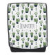 A personalized backpack with a rustic western flavor. Designed with a bunch of cute green cactuses in a repeating pattern. Specifically, green colored prickly cactus, in all kinds of shapes and sizes, each sitting in its own dark blue flower pot. Little decorative triangles in between them. Whimsical fun illustration.