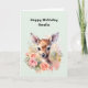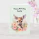 Birthday card with a beautiful illustration featuring a cute deer. Surrounded by pink roses and flowers.
