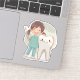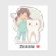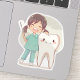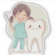 Cute sticker featuring a kawaii female dentist, happy tooth, and toothbrush.