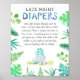 Cute Dinosaur Boy Baby Shower 'Late Night Diapers' Game. Design features watercolor botanical palm leaves and other tropical foliage with a little baby dino hatching out of an egg. A fun and easy baby shower game to play for the new parents to be.