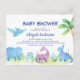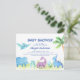 Cute Brachiosaurus, Stegosaurus, Pterodactyls, Dinosaurs that have Tropical Greenery Botanical Watercolor of green and blues Oh Boy Baby Shower Invitations Post Card on white background with baby TRex - includes beautiful and elegant script typography with modern tropical palm trees and greenery for the special Mother to Be celebration.