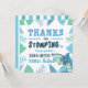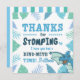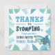 Dinosaur themed blue and green with color coordinated stripes on back, a cute thank you card to send your guests for attending the birthday party.. a place to add name