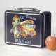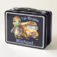 This is a cute lunch box for a boy featuring an adorable dinosaur with his backpack standing in front of a school bus. This lunch box is perfect for your child to carry their lunch to school every day. The text is customizable so you can personalize it to suit your needs.