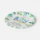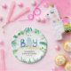 It's a Boy Dinosaur themed baby shower paper plate! Design features an adorable watercolor baby dinosaur just hatched from an egg, colorful typography, palm leaves and other botanical greenery.