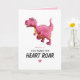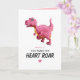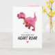 Dinosaur valentine's day card featuring a watercolor pink bay t-rex dinosaur, the childs name, a love heart, and the cute saying 'you make my heart roar'.