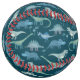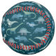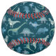 Lots of blue dinosaurs, Tyrannosaurus rex, Spinosaurus, Stegosaurus, Diplodocus and Triceratops on a dark teal green background. Original art by Nic Squirrell.