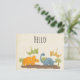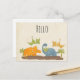 A hello postcard with a cute design featuring 4 dinosaurs. 2 are flying and 2 are on the ground. Created with watercolors.