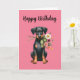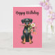 This adorable Doberman dog birthday card includes a cute Doberman dog holding flowers graphic as well as a custom saying on the inside. This design also includes a pink background. Enjoy this Doberman puppy birthday card!