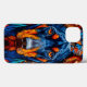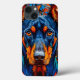 Striking and vividly colorful depiction of a dog's face, likely a Doberman. The dog’s fur is portrayed in deep blues and vibrant oranges, creating a bold and artistic contrast. The eyes are intensely luminous, drawing the viewer's attention, and the overall composition gives a sense of depth and texture.