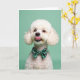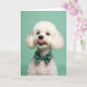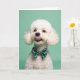 This card shows a small cream-colored dog, like a poodle or bichon, centered against a smooth mint green background with a calm St. Patrick’s Day feel ☘️. The dog wears a green-and-black plaid bow tie, and its dark, shiny eyes look straight ahead as if holding a friendly gaze with someone just off-camera. Soft, diffused light brings out the curl of its coat, with gentle shadows under the chin and around the ears that make the face look extra cuddly. A tiny pink tongue peeks out, adding a flirty, teasing note that feels like the dog is sharing a private joke with you 💚. The layout stays simple with lots of open space, keeping the focus on the dog’s face and bow tie. St. Patrick’s Day greeting text sits near the top in a darker green, with a smaller line near the bottom in black for balance. The mint backdrop remains plain and uncluttered, framed by the dog’s fluffy outline and the crisp plaid bow at the center.