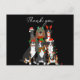 This thank you card features a fun, festive illustration of a group of six dogs dressed in holiday attire. Each dog has its own unique Christmas-themed accessories: Santa hats, reindeer antlers, a scarf, holiday lights, and even playful glasses shaped like Christmas trees. The dogs’ cheerful expressions and holiday decorations capture the joyful spirit of the season, making this card perfect for expressing gratitude with a touch of humor and charm. Ideal for dog lovers, this card brings a warm and festive vibe to any holiday thank you note.