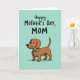 This greeting card features a cartoon-style long-bodied dog with short legs stretching across the lower part of the design, giving a friendly, affectionate look that feels like a warm nuzzle ❤️. The dog is reddish-brown with a dark outline, bright round eyes, and a small curved smile that reads as gentle and welcoming. A turquoise collar wraps its neck, adding a crisp pop of color against the earthy coat, and a soft shadow sits just beneath its feet on the flat background. The setting is simple and uncluttered, with a smooth pastel mint-green backdrop that keeps everything calm and easy on the eyes 🌼. Near the top, the phrase “Happy Mother’s Day,” appears in flowing black lettering, spaced so it feels airy and light above the dog. Just below that, “MOM” is written in larger, all-cap black letters, centered and easy to spot. The overall layout leaves plenty of breathing room, with the dog anchored at the bottom and the text stacked neatly above on the mint-green field. The dog’s reddish-brown body is outlined in black, and the bright turquoise collar stands out clearly against the pastel background.