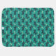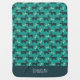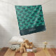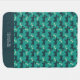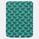 A pet blanket customized with a name and designed with a repeating pattern featuring a cute smiling doggy with floppy ears and a dog bone. Green background.