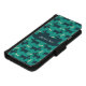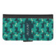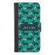 A phone case wallet personalized with a name and designed with a repeating pattern featuring a cute smiling doggy with floppy ears and a dog bone. Green background.