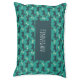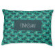 A personalized pet bed designed with a repeating pattern featuring a cute smiling doggy with floppy ears and a dog bone. Green background.