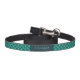 A dog leash personalized with your pet's name designed with a repeating pattern featuring a cute smiling doggy with floppy ears and a dog bone. Green background.