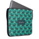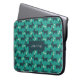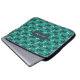 Laptop sleeve designed with a repeating pattern featuring a cute smiling doggy with floppy ears and a dog bone. Green background.