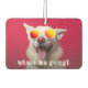 "Where we going?" text over a cute dog photo (can be changed to your dog) on a fun air freshener. An affordable gift for family, friends or create for yourself, they are double-sided and available in different shapes and several amazing long lasting, odor eliminating scents.