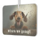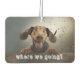 "Where we going?" text over a cute dog photo (can be changed to your dog) on a fun air freshener. An affordable gift for family, friends or create for yourself, they are double-sided and available in different shapes and several amazing long lasting, odor eliminating scents.