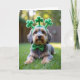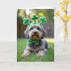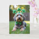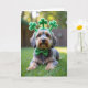 This card shows a small terrier-mix dog lounging on a thick stretch of green grass, photographed from a low angle that makes its dark eyes feel close and inviting 💚. The dog wears a green headband topped with three plush shamrocks and an emerald green bow tie dusted with glitter, as if it dressed up just to catch someone’s attention ☘️. Soft outdoor light falls across its face, and the gentle tilt of its head suggests the kind of quiet affection you see between good friends. Its fur mixes cool greys with warm honey-gold around the muzzle and paws, standing out against the sharp blades of grass below. The background fades into a softly blurred wash of sunlit leaves, keeping the focus on the dog’s patient, tender gaze. “Happy St. Patrick’s Day” sits near the top in green lettering, with smaller gold text near the bottom left for a neat balance. Tiny sparkles on the bow tie catch the light, and the three shamrocks stand upright against the green, leafy blur behind them.