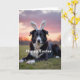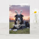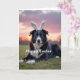 This card features a black-and-white domestic dog centered in the frame, lying in fresh green grass with fluffy white bunny ears perched on its head 🐰. The dog’s amber eyes look straight ahead with a gentle, inviting gaze, as if sharing a quiet moment with a close friend nearby. Soft sunrise tones—lavender, rosy pink, and a touch of warm golden brown—spread across the sky behind it, giving the whole scene a calm, romantic glow. The light catches the dog’s fur and the fine blades of grass, making the foreground look slightly dewy and soft to the eye 🌷. A short message appears along the bottom edge in white lettering, standing out clearly against the darker grass. The text sits low and wide, leaving the dog’s face unobstructed as the main focus. In the background, the sky fades smoothly from pale purple to warm peach near the horizon.