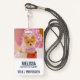 Name badge with an adorable Christmas dog wearing a cute pink plaid bow tie. This tiny little pet is sitting inside a whimsical hat box. A white tree decorated with pink lights in the background. The lights are blurred giving it a magical bokeh effect. Darling Christmas themed photograph. Perfect for dog lovers.