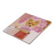 A ceramic tile with an adorable Christmas dog wearing a cute pink plaid bow tie. This tiny little pet is sitting inside a whimsical hat box. A white tree decorated with pink lights in the background. The lights are blurred giving it a magical bokeh effect. Darling Christmas themed photograph. Perfect for dog lovers.