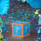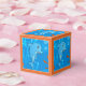 A graphic aquatic illustration of a cute dolphin on a party favor box. ©2014charmainepaulson