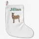 Perfect! Exactly what I ordered! I uploaded a picture of my blue chow, and the screen print was incredible. the back side of the stocking was the red and black checkered print. my puppy's name was also printed on the cuff of the stocking. PERFECT! Highly recommend this product! My puppy's name was screen printed onto the cuff of the stocking, the font was perfect!