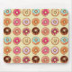 Deliciously cute multi-colored illustrated doughnut pattern on soft pastel polka dot background.