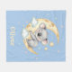 This personalized fleece blanket features a cute baby koala curled up sleeping on a crescent moon with glowing stars on a whimsical pastel blue background.