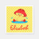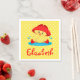 A cute yellow and white polka dot background, there is an adorable duck playing in a puddle of water. There is a template for inserting a name at the bottom. Order your paper napkins today!