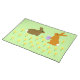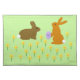 This awesome placemat features a pair of cute little Easter bunnies surrounded by yellow daffodil flowers. The rabbits are brown with big ears, black eyes and fluffy white tails. One of the bunnies is holding an Easter egg with a pretty purple bow on it and is reaching out to offer it to the other bunny. The daffodils are yellow with a bright orange center.